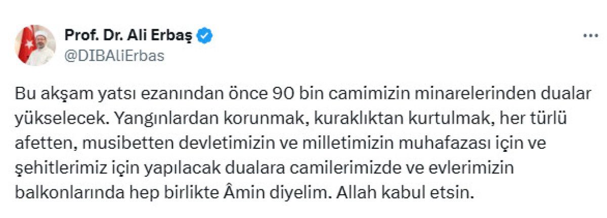 Erbaş paylaşımında, ülke genelindeki mescitlerde kuraklık, afetler ve şehitler için dualar edileceğini bildirdi.