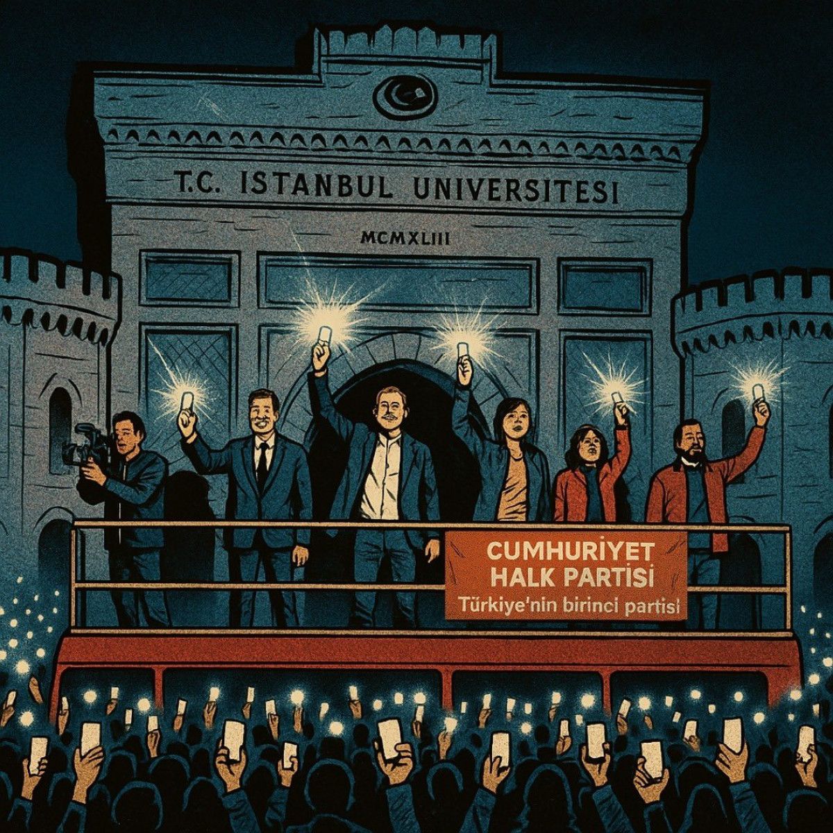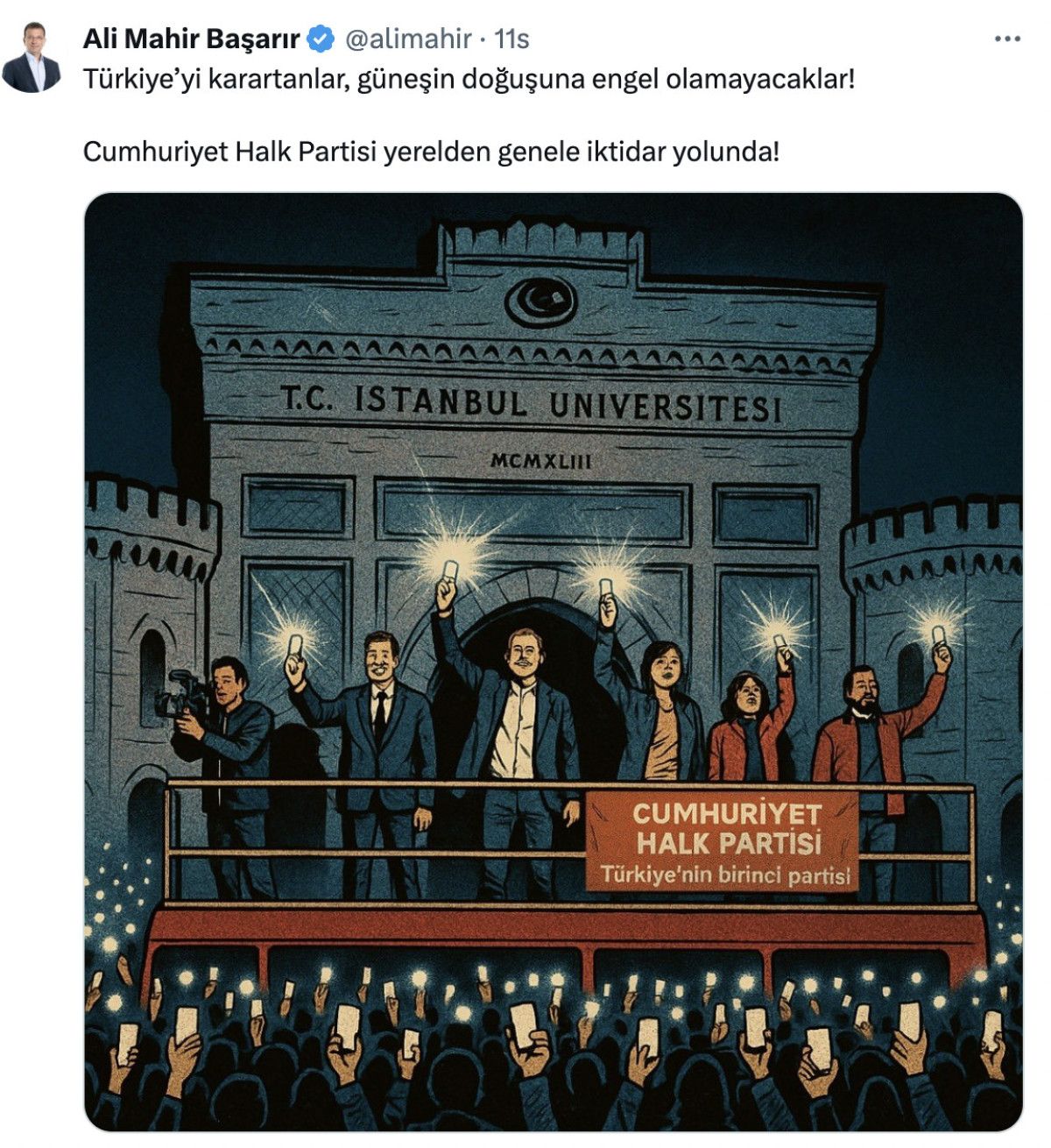 CHP Küme Başkanvekili Ali Yetenekli Başarır’ın miting sonrası yaptığı paylaşımdaki görselde, İstanbul Üniversitesi Beyazıt Yerleşkesi’nin girişindeki kapıda yer alan Fetih Müddeti’nin 3. ayeti ve Sultan Abdülaziz’in Tuğrası’nın silindiği görüldü.
