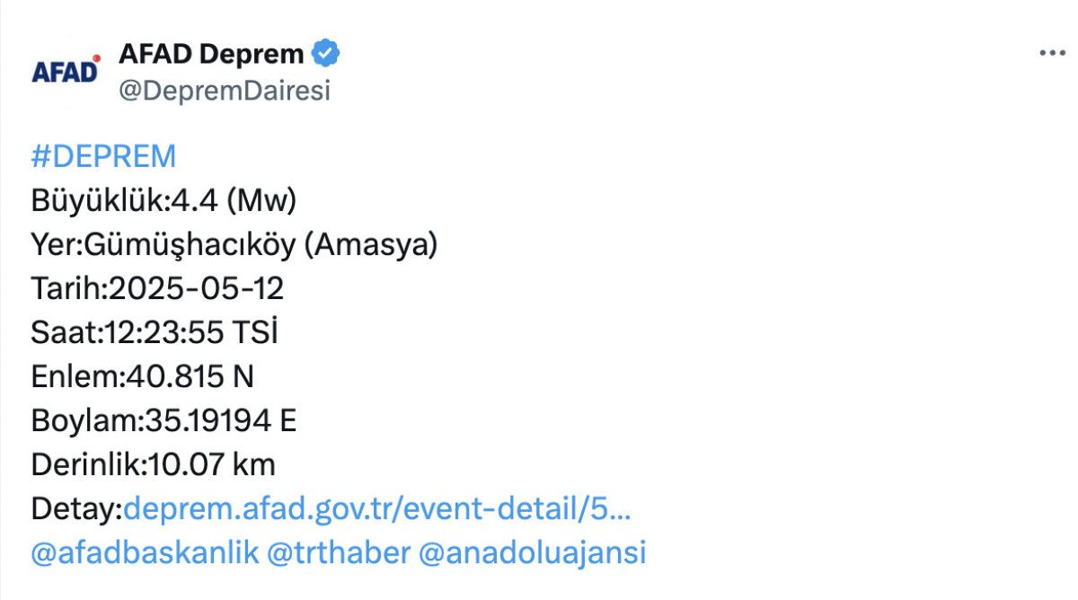 AFAD internet sitesinde yer alan bilgiye nazaran; Amasya’nın Gümüşhacıköy ilçesinde, saat 12.23’te 4.4 büyüklüğünde sarsıntı kaydedildi.