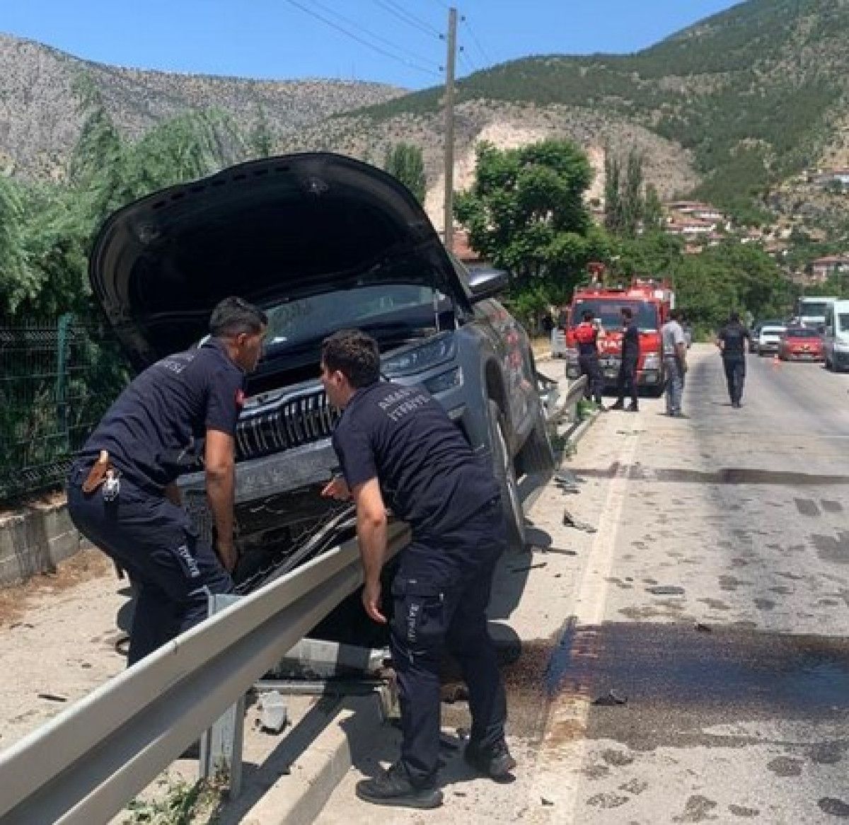 Amasya’da Nurhan A. yönetimindeki 06 EBS 763 plakalı otomobil, Helvacı Mahallesi Çağlayan Caddesi’nde yol kenarındaki bariyerlere çarparak sürüklendi.