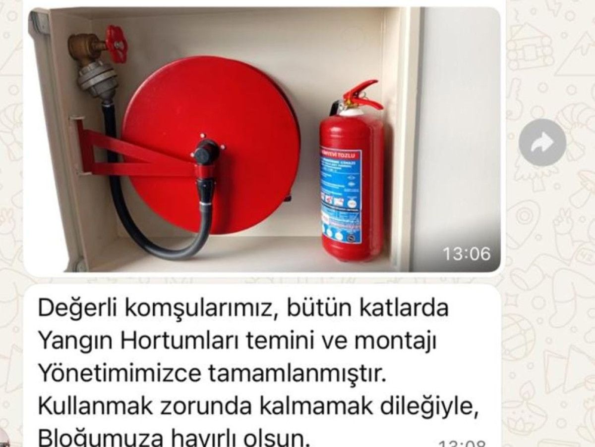 Öte yandan site idaresinin Kartalkaya’daki otel yangınından sonra bütün katlara yangın hortumu yapılması için daire başı 8 bin TL topladığı ve yönetici F.A.’nın 3 Haziran’da, WhatsApp kümesine “Değerli komşularımız; bütün katlara yangın hortumları temini ve montajı idaremizce tamamlanmıştır. Kullanmak zorunda kalmamak dileğiyle, bloğumuza iyi olsun” mesajı attığı öğrenildi.