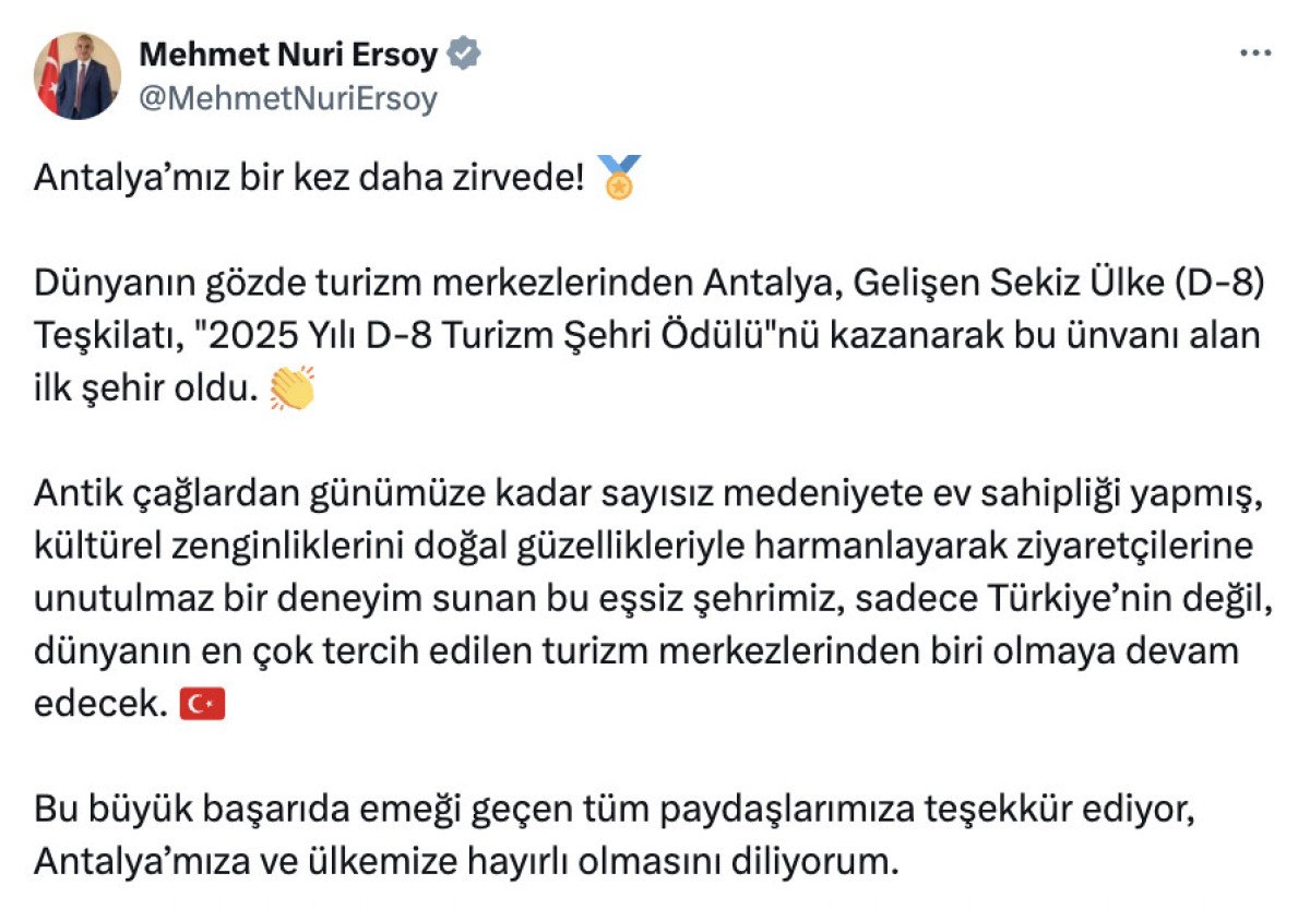 Dünyanın gözde turizm merkezlerinden Antalya’nın, Gelişen Sekiz Ülke Teşkilatı “2025 Yılı D-8 Turizm Şehri Ödülü”nü kazanarak bu ünvanı alan ilk şehir olduğunu bildiren Ersoy, şunları kaydetti: