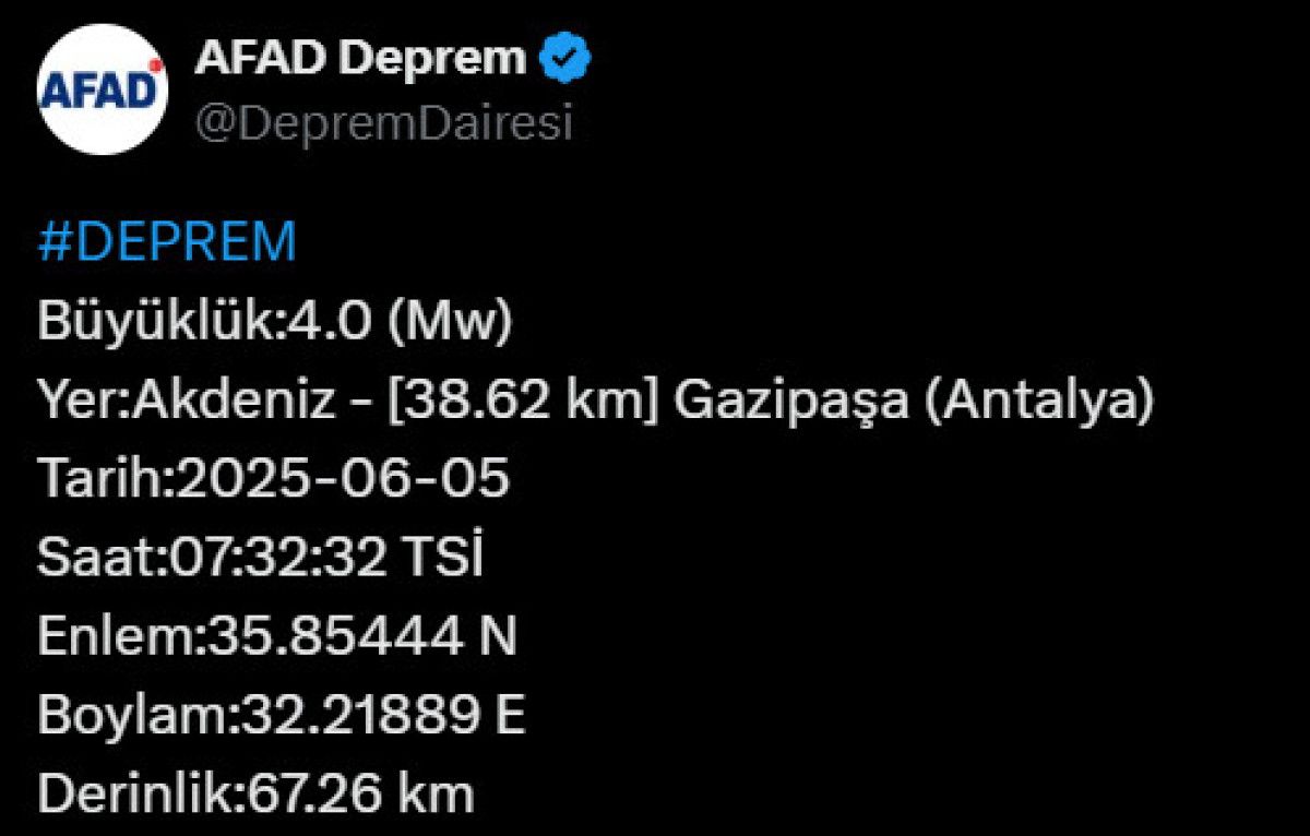 Antalya’nın Gazipaşa ilçesine 38.62 kilometre uzaklıktaki sarsıntının 67.26 kilometre derinlikte meydana geldiği belirlendi.