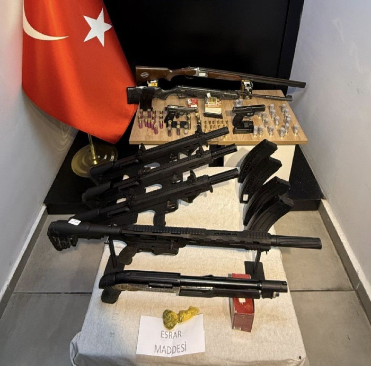 Antalya İl Emniyet Müdürlüğü ünitelerinin iştirakiyle gerçekleştirilen operasyonda, yapılan aramalarda 7 adet pompalı tüfek, 2 adet ruhsatsız tabanca, 129 adet kartuş, 100 adet fişek ile 9 gram esrar ele geçirildi.