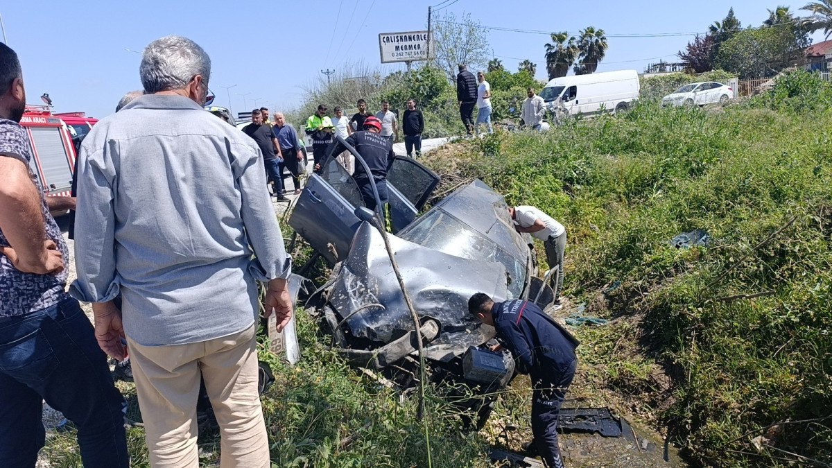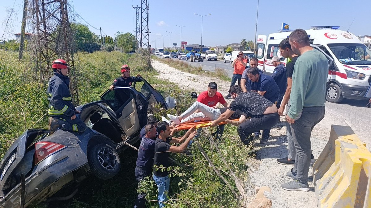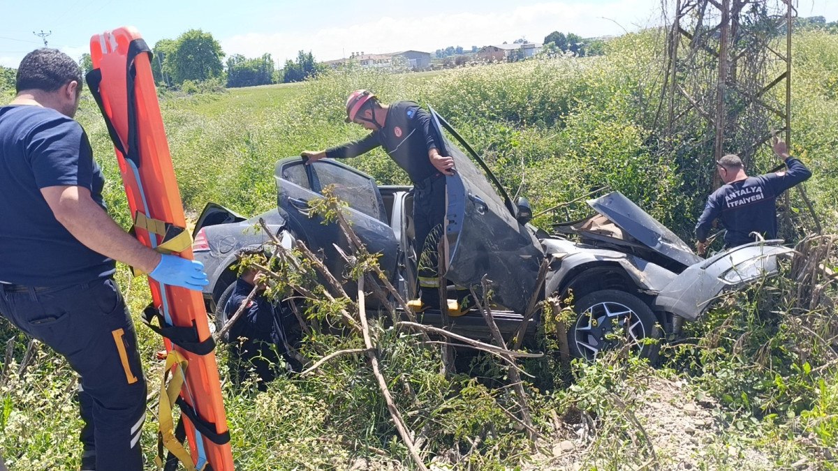 Antalya’da bariyerlere çarpan araç, sulama kanalına devrildi
