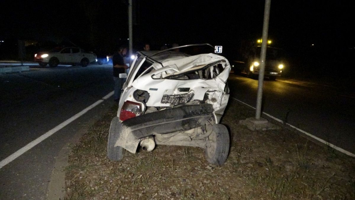 Çarpmanın şiddetiyle araba refüje çıkarak hurdaya dönerken, kamyon yol kenarındaki yüksek tansiyon sınırı direğini devirdikten sonra tarlaya girerek durabildi.