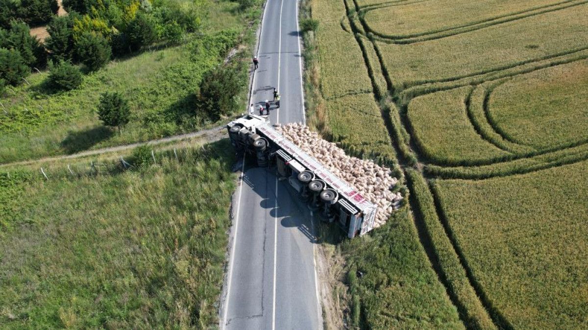 Devrilen tır ve etrafa saçılan patatesler, dron kamerasıyla havadan görüntülendi. Tırı kaldırma çalışmaları ise hala sürüyor.