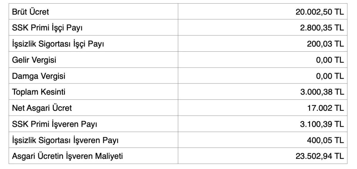 Asgari ücretin işverene toplam maliyeti, bir işçi için 23 bin 502 lira 94 kuruş. Bunun 20 bin 2 lira 50 kuruşunu brüt asgari ücret, 3 bin 100 lira 39 kuruşunu sosyal güvenlik primi, 400 lira 5 kuruşunu ise işveren işsizlik sigorta fonu oluşturuyor.