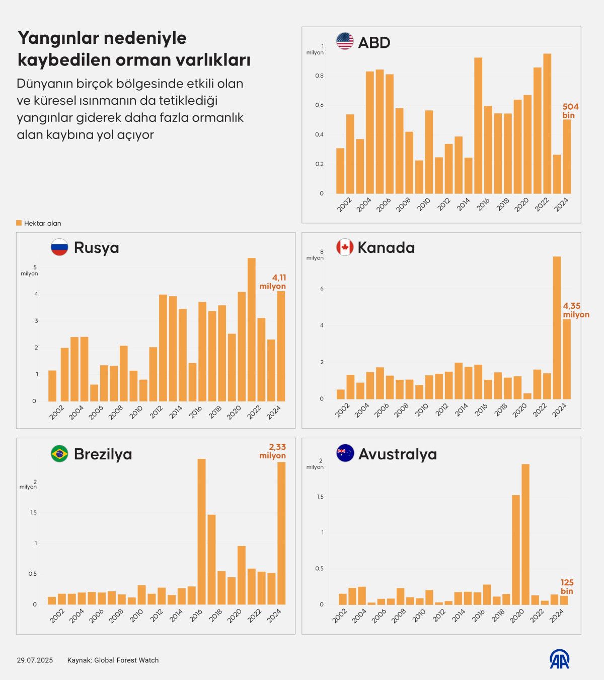 Kanada’da ise yılda ortalama 1,86 milyon hektar ormanlık alan yangınlardan ziyan görüyor. Ülkede bilhassa son 3 yılda orman yangınlarında değerli artış görülürken, 2024’te yangınlardan etkilenen alanın büyüklüğü 4,35 milyon hektara yükseldi.