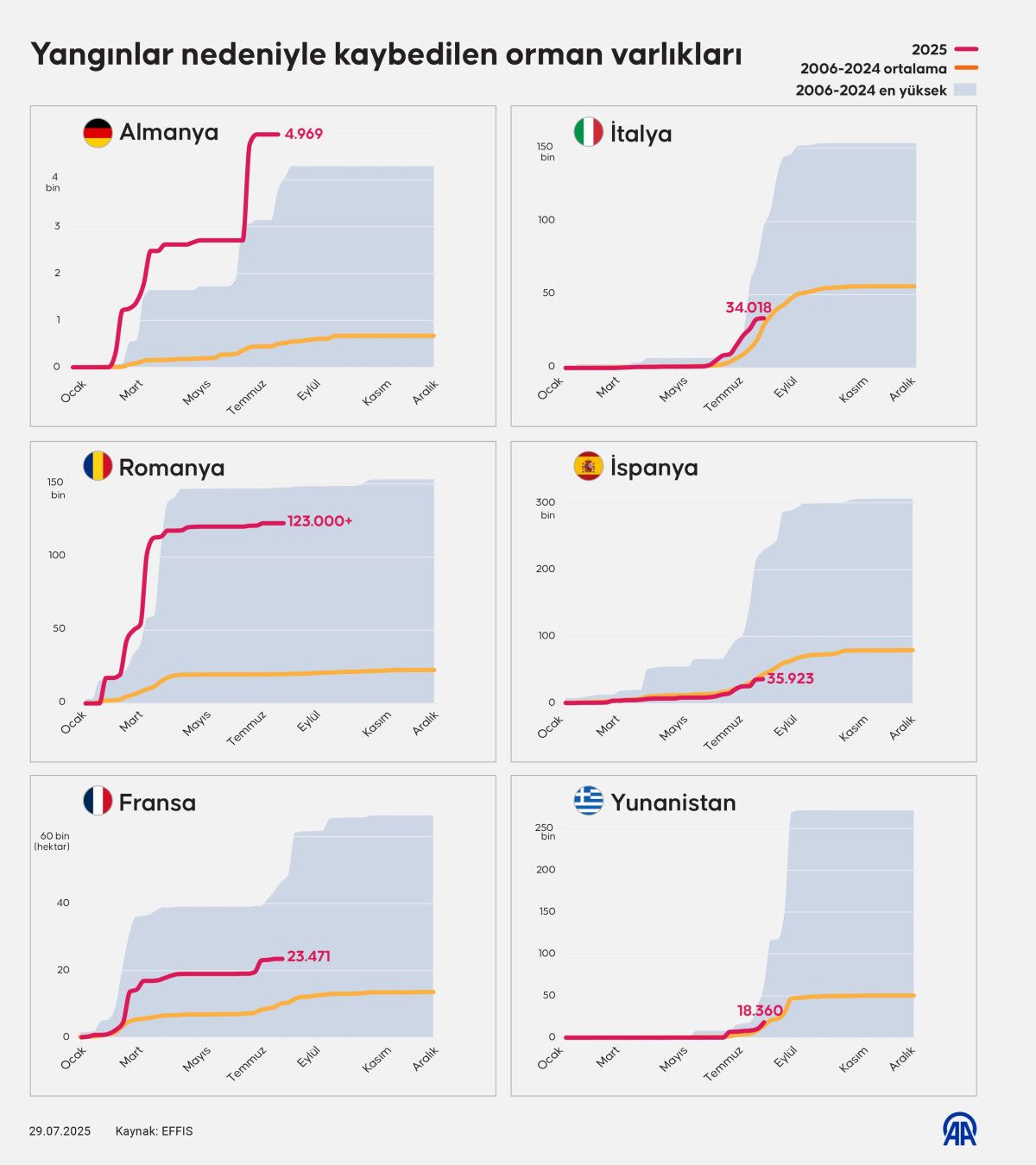 Avrupa Orman Yangınları Bilgi Sistemi bilgilerinden derlenen bilgilere göre, Avrupa Birliği (AB) ülkelerinde yılın başından bu yana çıkan orman yangınlarında 29 Temmuz prestijiyle 292 bin 855 hektar büyüklüğünde alan yandı.