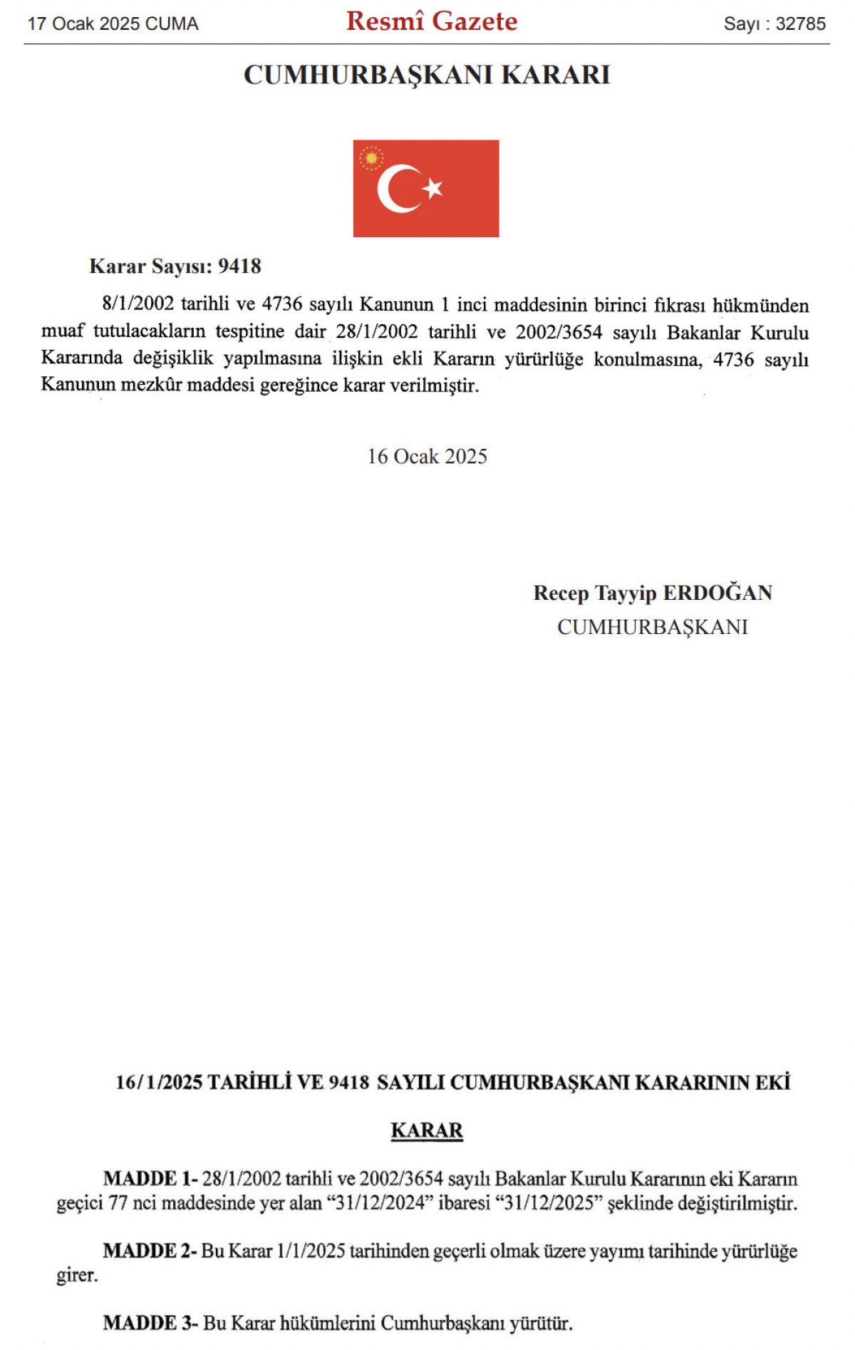 Bugün Resmi Gazete’de yayınlanan ilana göre 8/1/2002 Tarihli ve 4736 Sayılı Kanunun 1 inci Maddesinin Birinci Fıkrası Hükmünden Muaf Tutulacakların Tespitine Dair 28/1/2002 Tarihli ve 2002/3654 Sayılı Bakanlar Kurulu Kararında Değişiklik Yapılması Hakkında Karar verildi.