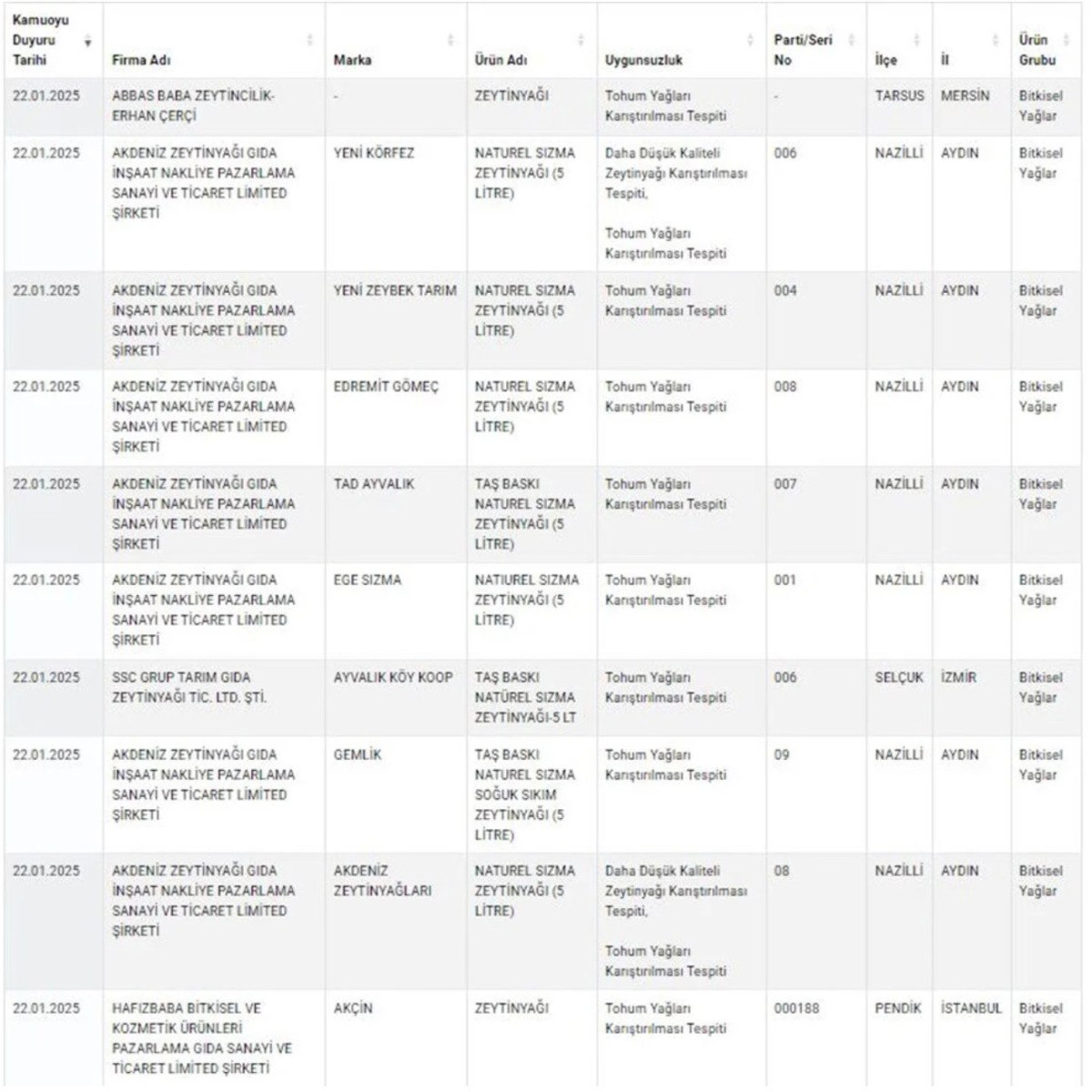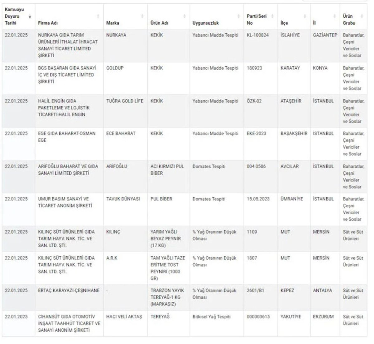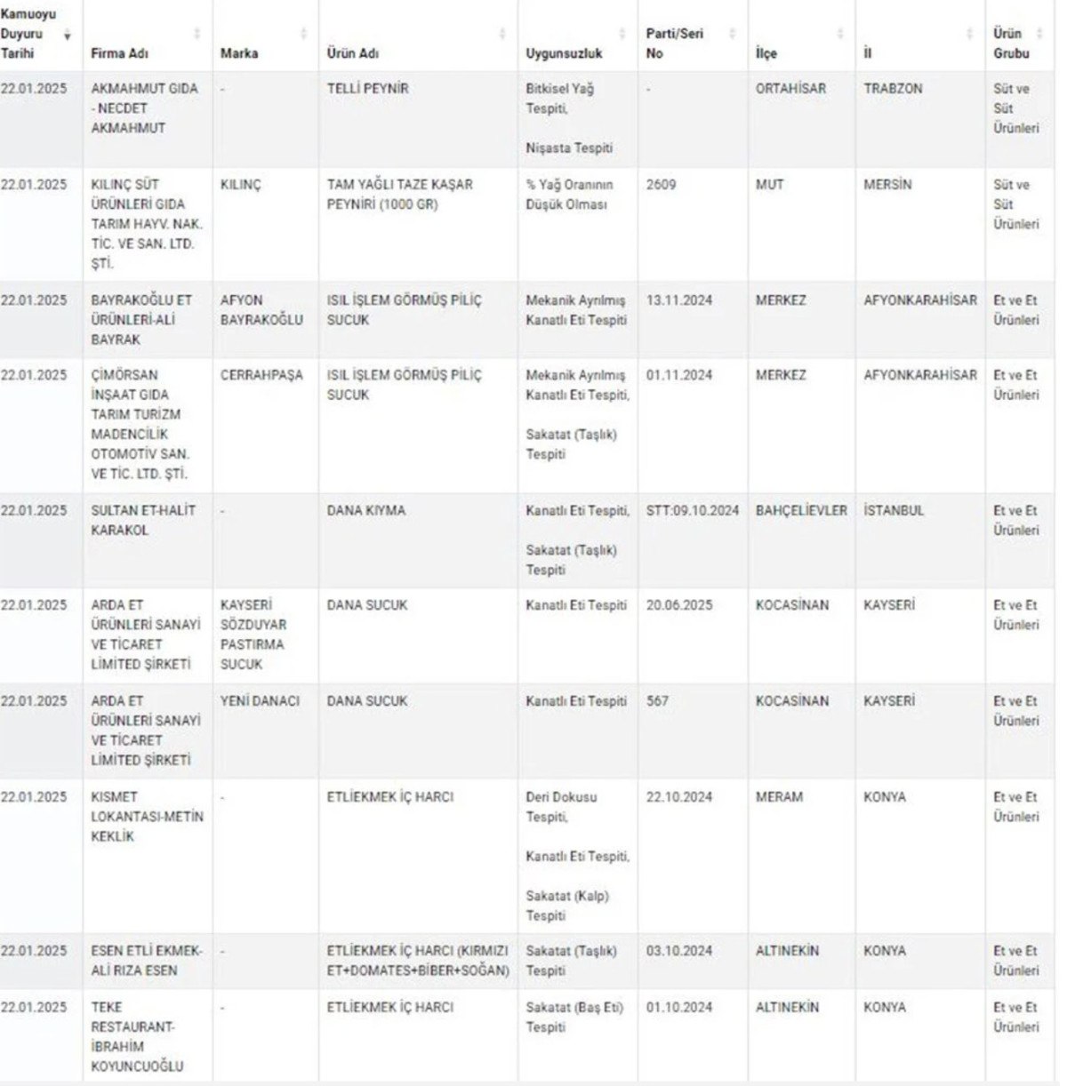– Zeytinyağında tohum yağları, baharatlarda yabancı madde, piliç sucukta kanatlı eti ve sakatat, Etliekmek harcında deri, kanatlı eti ve sakatat tespit edildi.