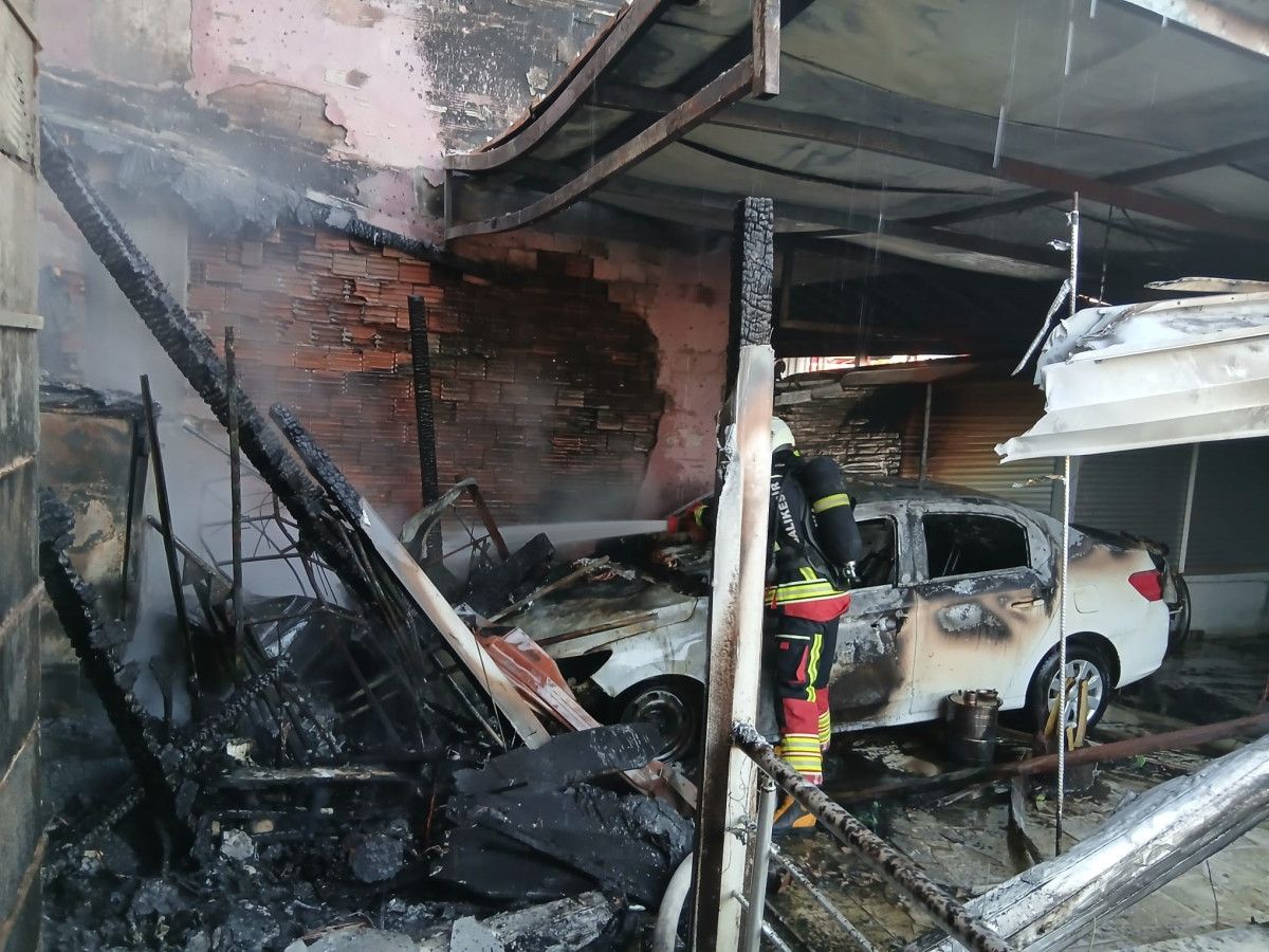 Evin birtakım kısımlarında maddi hasara neden olan yangında, konutun yan tarafındaki öbür binanın bahçesindeki bir öbür araç da alevlerden kısmen etkilendi.