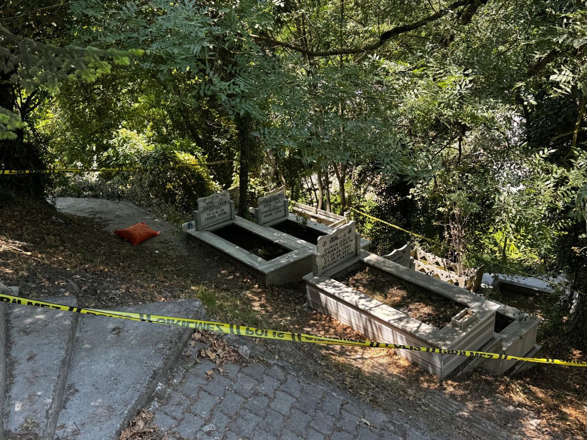 Olay yerine gelen polis ve olay yeri inceleme takımları, mezar etrafına güvenlik şeridi çekti.