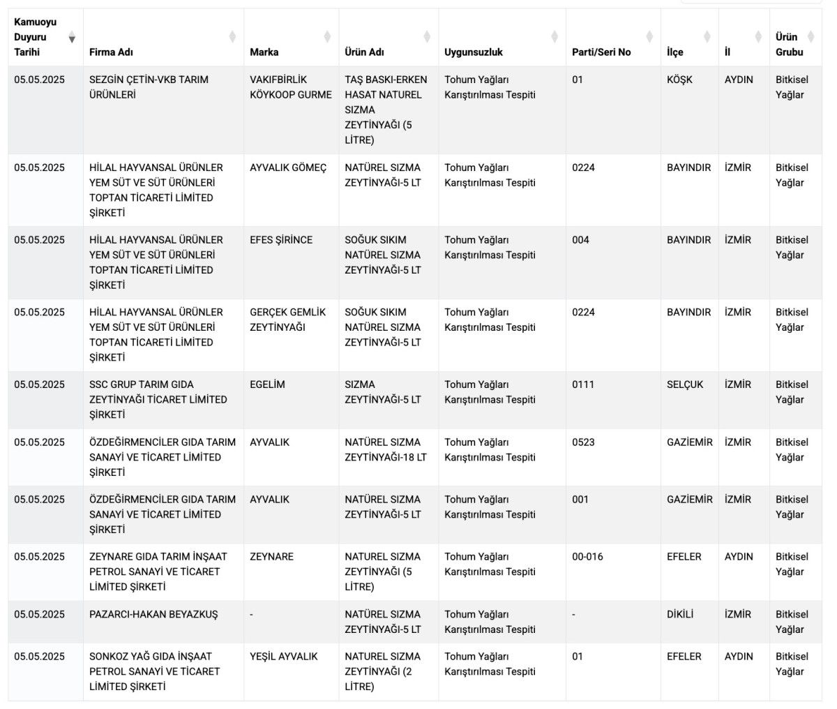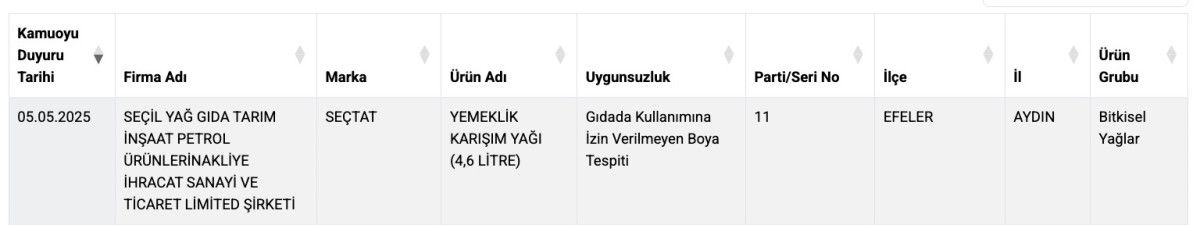 Aydın ilinin Efeler ilçesinde faaliyet gösteren Seçil Yağ Besin Tarım İnşaat Petrol Eserleri Nakliye İhracat Sanayi ve Ticaret Limited Şirketi, Seçtat markalı yemeklik karışım yağa (4,6 litre), gıdada kullanımına müsaade verilmeyen boya tespit edildi.
