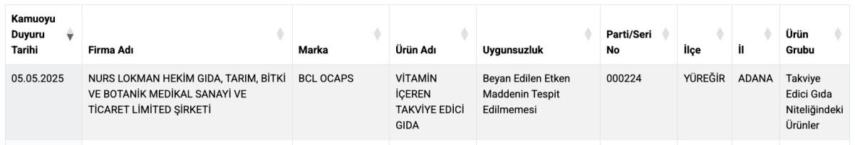 Adana ilinin Yüreğir ilçesinde Nurs Lokman Tabip Besin, Tarım, Bitki ve Botanik Medikal Sanayi ve Ticaret Limited Şirketi BCL Ocaps markalı vitamin içeren destek edici gıdada, beyan edilen etken hususun tespit edilmemesi teklidine rastlandı.
