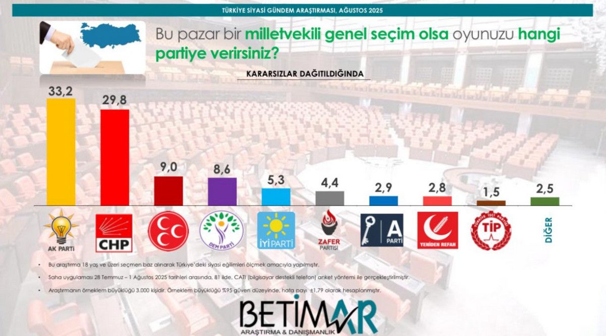 Betimar’ın yapmış olduğu anket sonucu ve öteki partilerin oy oranları ise şu şekilde: