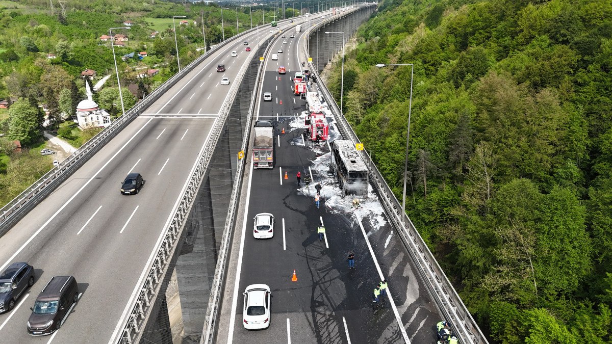 İstanbul yönüne ilerleyen Kenan B. yönetimindeki 34 MTC 935 plakalı, 33 yolcuyu taşıyan otobüs, saat 10.00 sıralarında Anadolu Otoyolu Bolu Dağı 1’inci Viyadük mevkisinde motor bölümünden aniden alev aldı.