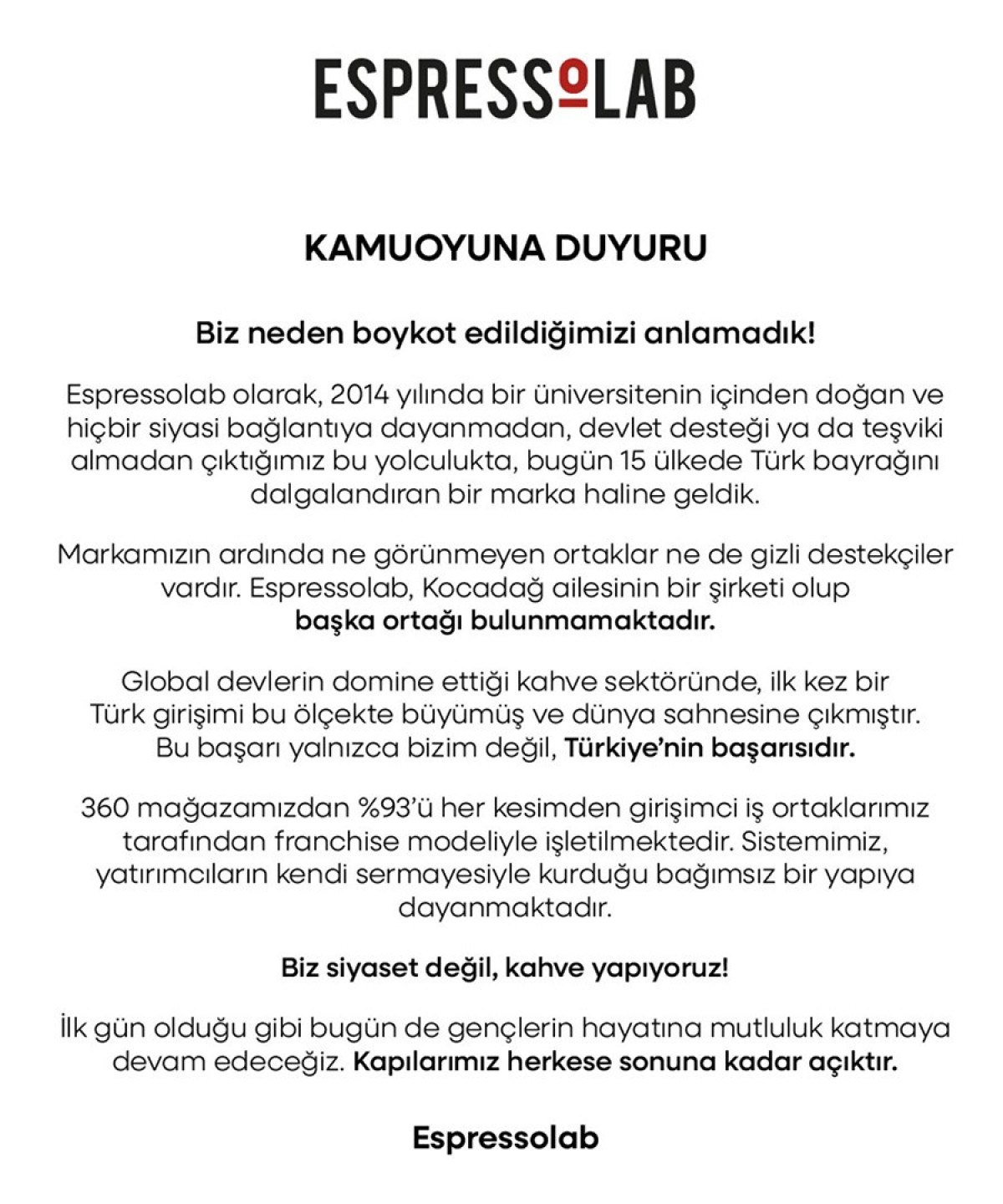 Espressolab’ın yaptığı açıklamada, markanın arkasında görünmeyen ortak ya da gizli destekçi bulunmadığı belirtilerek, “Espressolab, Kocadağ ailesinin bir şirketi olup başka ortağı bulunmamaktadır. Biz siyaset değil, kahve yapıyoruz. Global devlerin domine ettiği kahve sektöründe ilk kez bir Türk girişim bu ölçekte büyümüş ve dünya sahnesine çıkmıştır.” denildi.