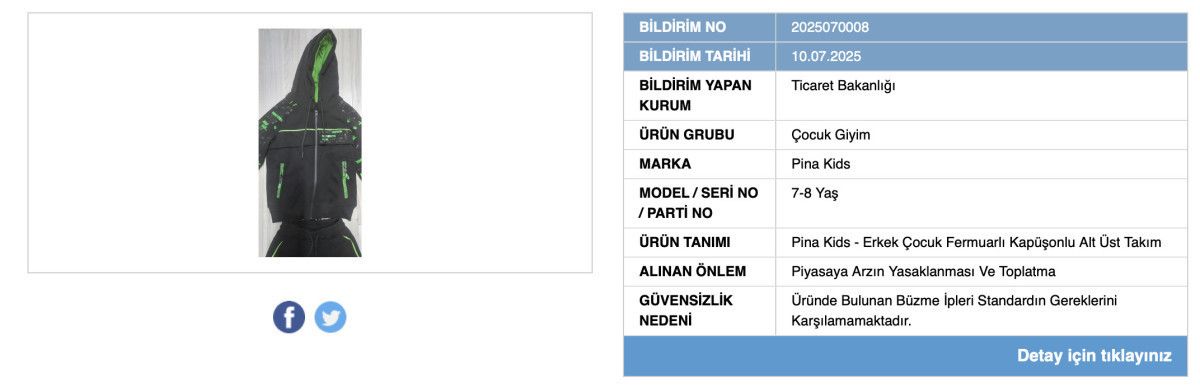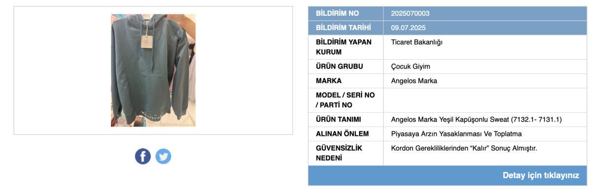 Güvensiz Eser Bilgi Sistemi’nde yayımlanan bilgilere nazaran, Angelos marka yeşil kapüşonlu sweat ile Pina Kids marka erkek çocuk fermuarlı kapüşonlu alt-üst kadro eserlerinde güvensizlik ögeleri tespit edildi.