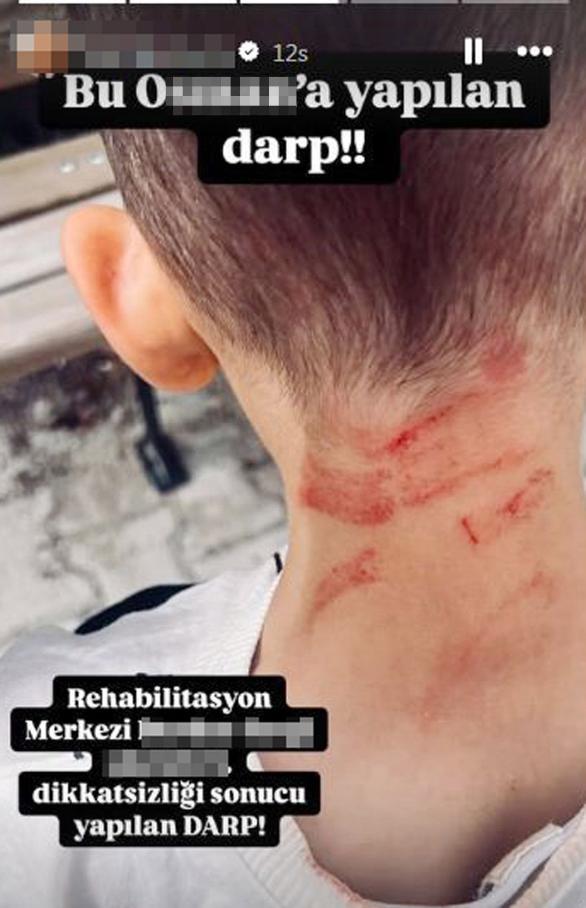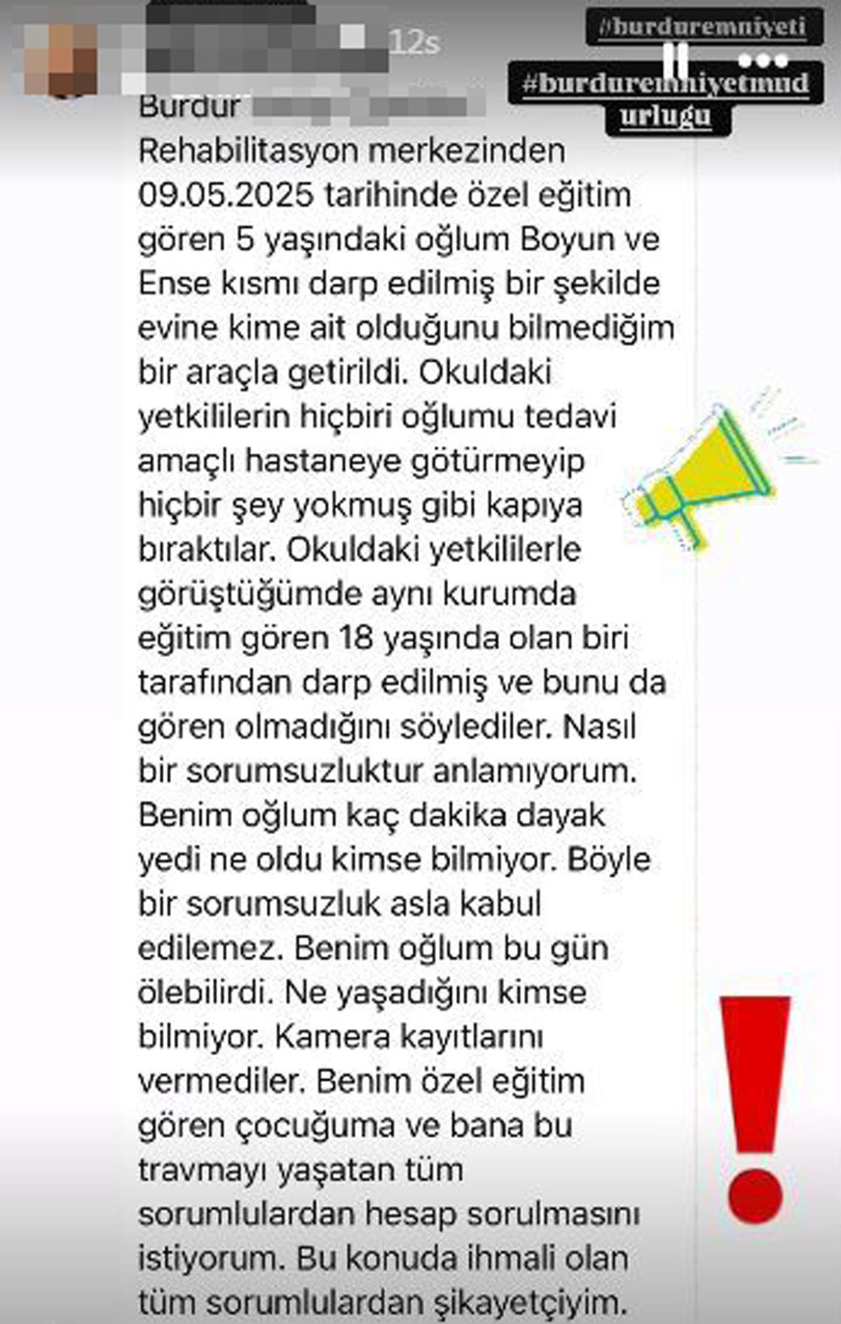 S.B.’nin paylaşımında, “Özel eğitim gören 5 yaşındaki oğlum boyun ve ense kısmı darbedilmiş bir halde meskenine kime ilişkin olduğunu bilmediğim bir araçla getirildi. Okuldaki yetkililerin hiçbiri oğlumu tedavi gayeli hastaneye götürmeyip hiçbir şey yokmuş üzere kapıya bıraktı.