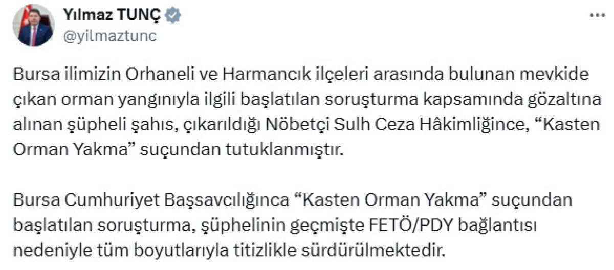 Bursa Cumhuriyet Başsavcılığınca “Kasten Orman Yakma” kabahatinden başlatılan soruşturma, şüphelinin geçmişte FETÖ/PDY kontağı nedeniyle tüm boyutlarıyla titizlikle sürdürülmektedir.