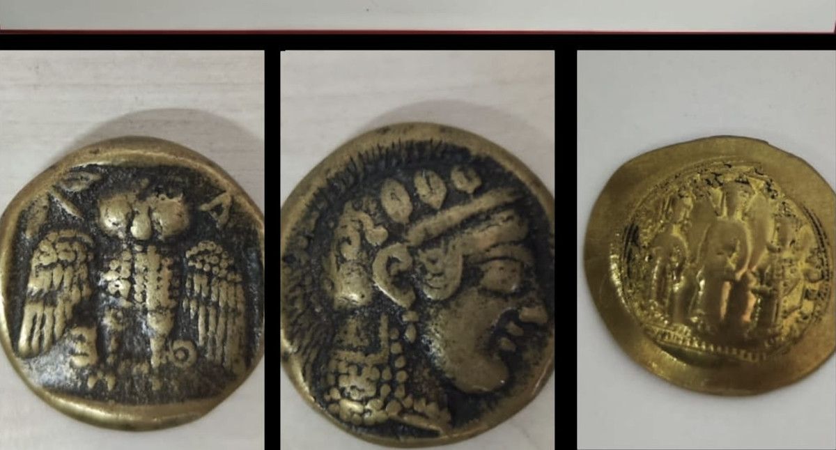 Şüphelinin üzerinde yapılan aramada, Bizans ve Roma devirlerine ilişkin 17 bronz ve 5 altın sikke ele geçirildi.