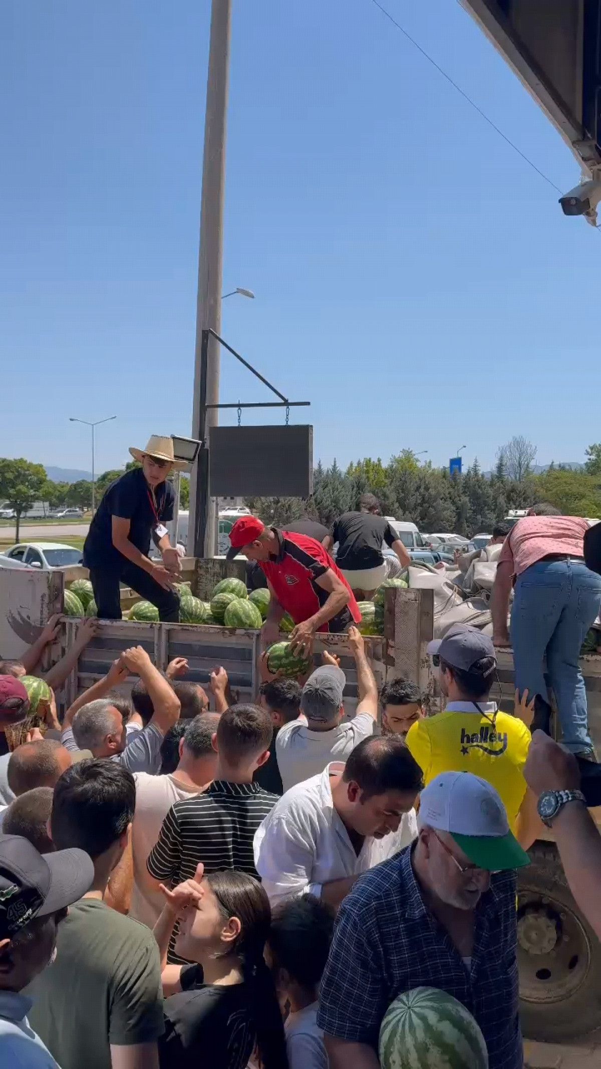 İnegöl-Alanyurt yolu üzerindeki mağaza, müşterilerine sürpriz yaparak kamyon kasasında bulunan 12 ton karpuzu fiyatsız dağıttı.