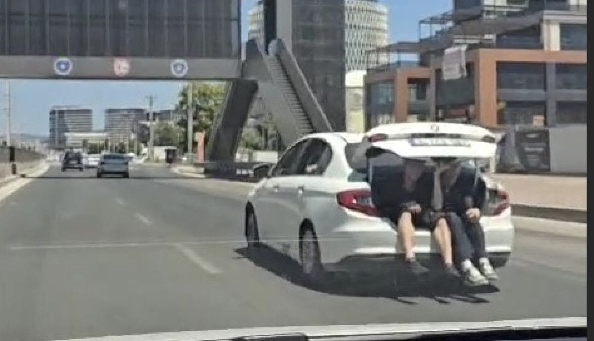 Aynı bölgede seyreden bir arabada iki kişi, aracın bagajında, kapı açık biçimde seyahat etti.