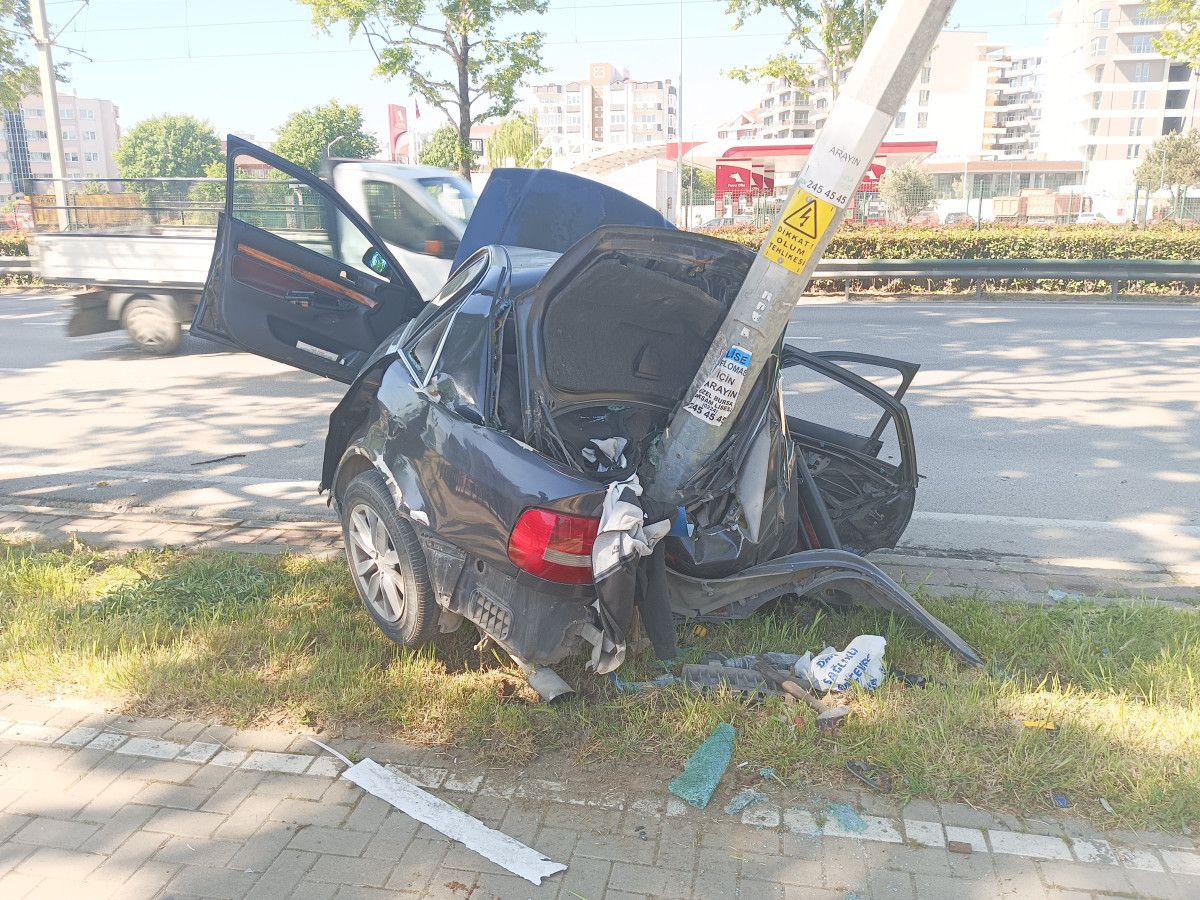 Kontrolden çıkan araba, yol kenarındaki aydınlatma direğine çarptı.