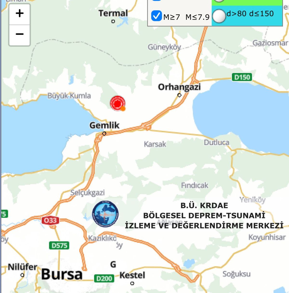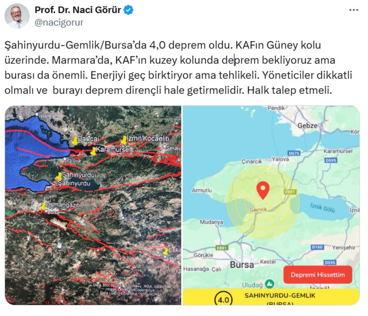 Bugün Bursa Gemlik‘te 5 km derinlikte dört M4.0 büyüklüğünde bir sarsıntı olmuştur. Bu sarsıntının olduğu kırık Kuzey Anadolu Kırığı’nın ikinci kolu ortadaki ikinci koludur. Zelzele Gemlik İznik kolu üzerinde oluşmuştur. Marmara’da KAK’ın 3 kolu vardır. Kuzey Marmara kolu, Gölcük üzerinden İstanbul’da oradan Saros Körfezi’ne masraf. Öteki kol Akyazı, Pamukova üzerinden Gemlik ve oradan Bandırma‘ya gerçek uzanır. Öteki Güney kol ise Yenişehir üzerinden Bursa Bursa’dan Mustafa Kemal Paşa oradan Manyas Gölü’ne gerçek uzanır bunlardan en faal olan kuzey koludur. Sonra Bursa kolu gelir.