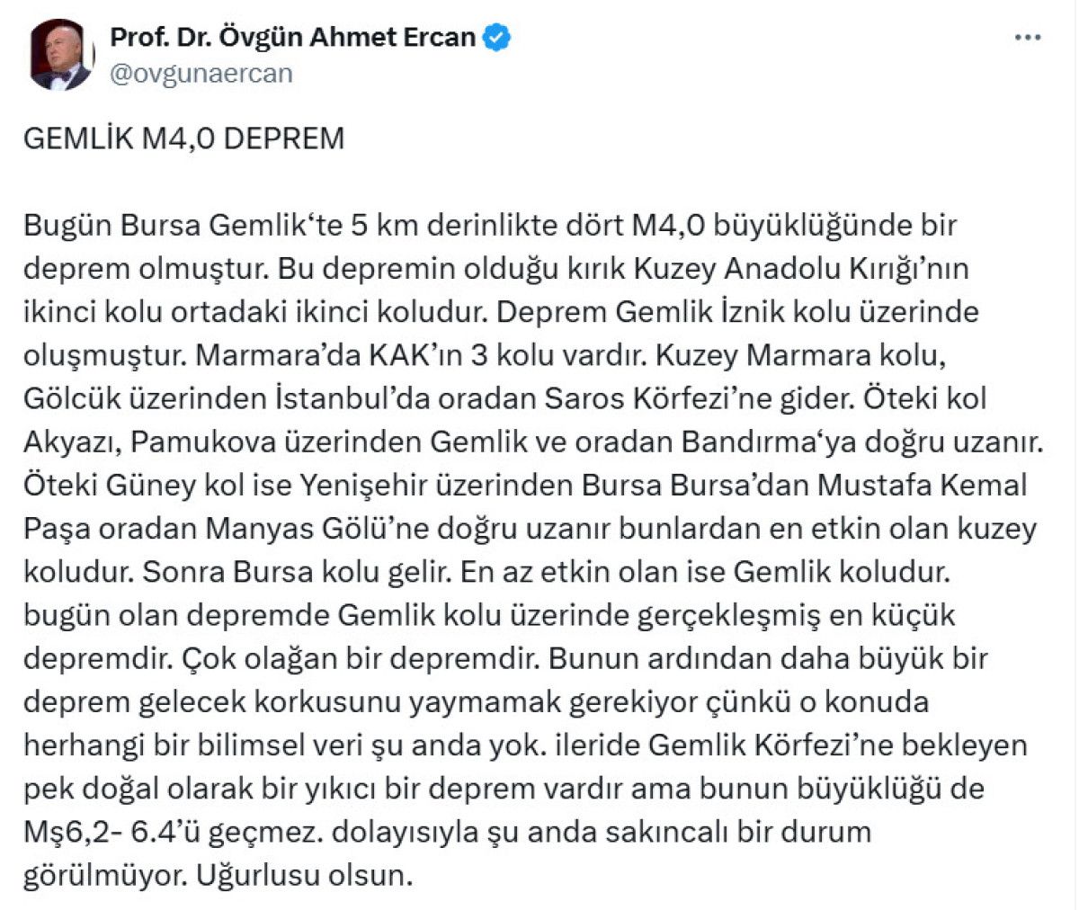 Depreme ait toplumsal medya hesabından değerlendirmede bulunan Prof. Dr. Naci Görür de şunları söyledi: