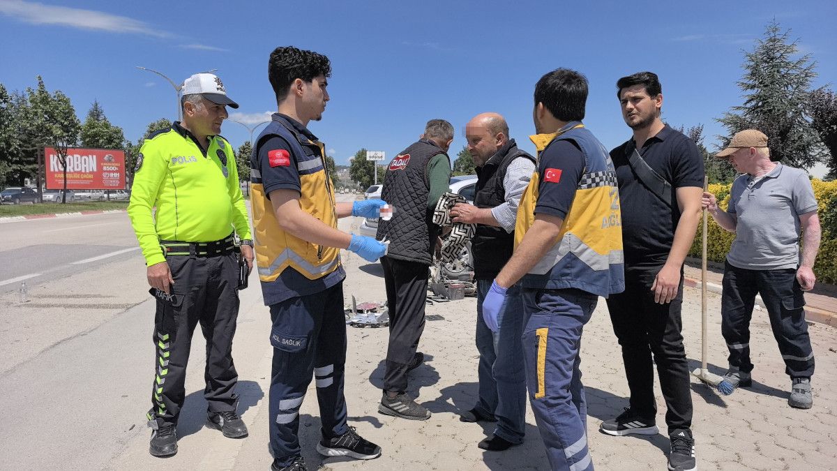 Kanlar içindeki yaralı, parçalanan elektrikli bisikletini toplamaya çalışırken, olay yerine gelen 112 Acil Servis ambulansında vazifeli sıhhat takımlarına de hastaneye gitmemek için direndi.
