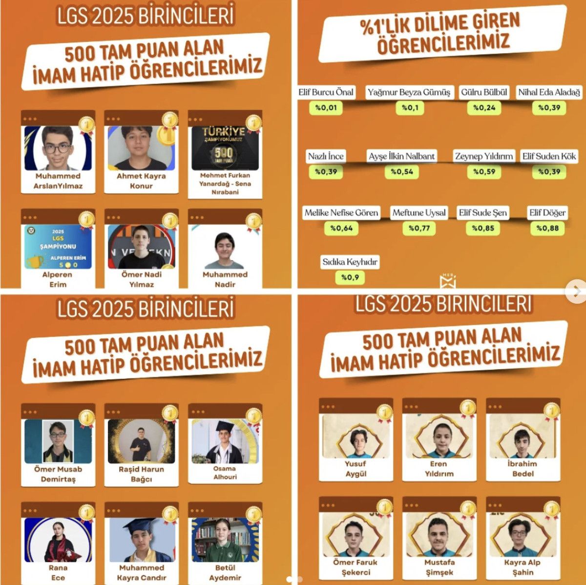 Bursa Mahmut Celalettin Ökten İmam Hatip Ortaokulu, LGS’de şampiyon çıkarmamasına karşın okulun toplumsal medya hesabından Türkiye genelinde 500 tam puan alarak birinci olan 63 imam hatip ortaokulu öğrencisinden 36’sının fotoğraflarını paylaşarak tebrik etti.