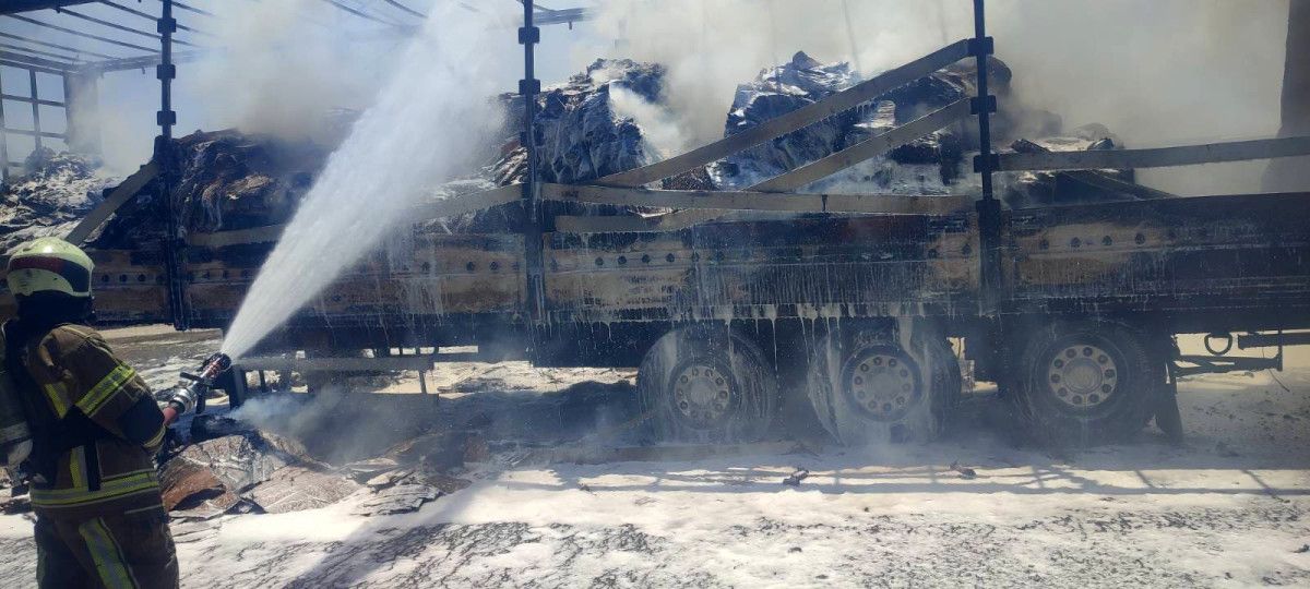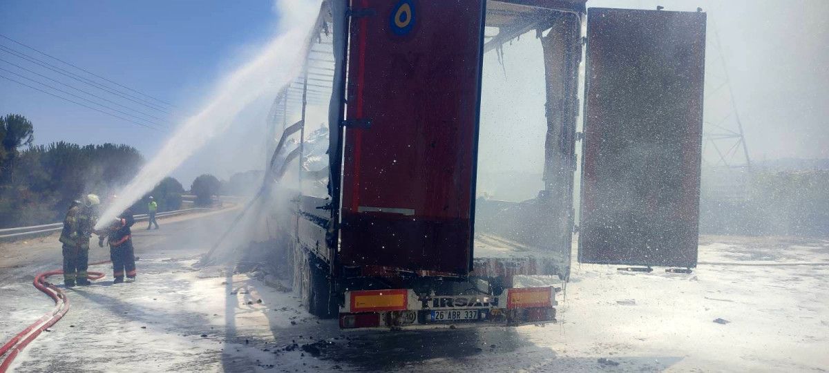Bursa’nın Karacabey ilçesinde Mustafa G. yönetimindeki cazibeli ve karton yüklü tırın dorsesinden dumanlar yükselmeye başladı.