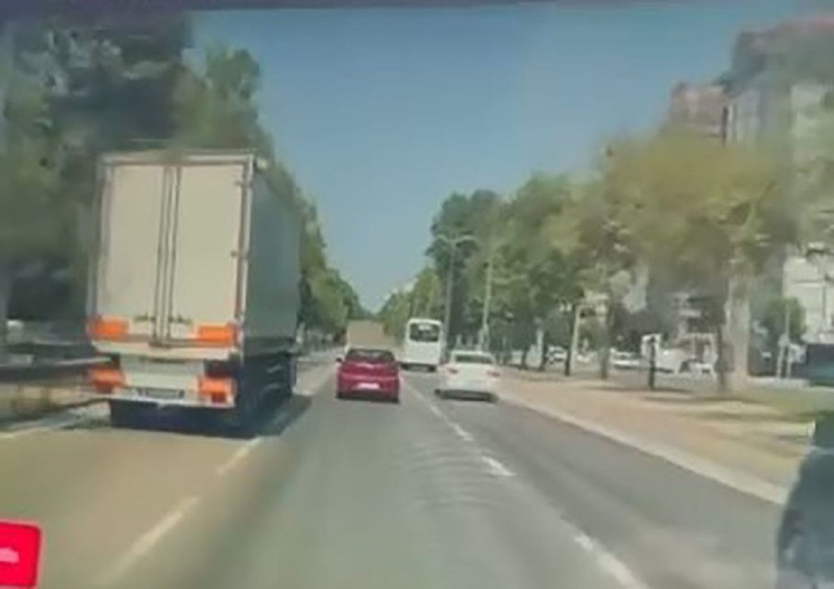 Sol şeritten ilerleyen tır, beyaz arabanın ilerlediğini görünce orta şeride geçmek istedi.