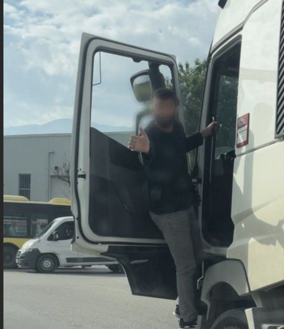 Trafiği durduran tır şoförünün aracına binerken el kol hareketleri yapması da kayıtlara yansıdı.