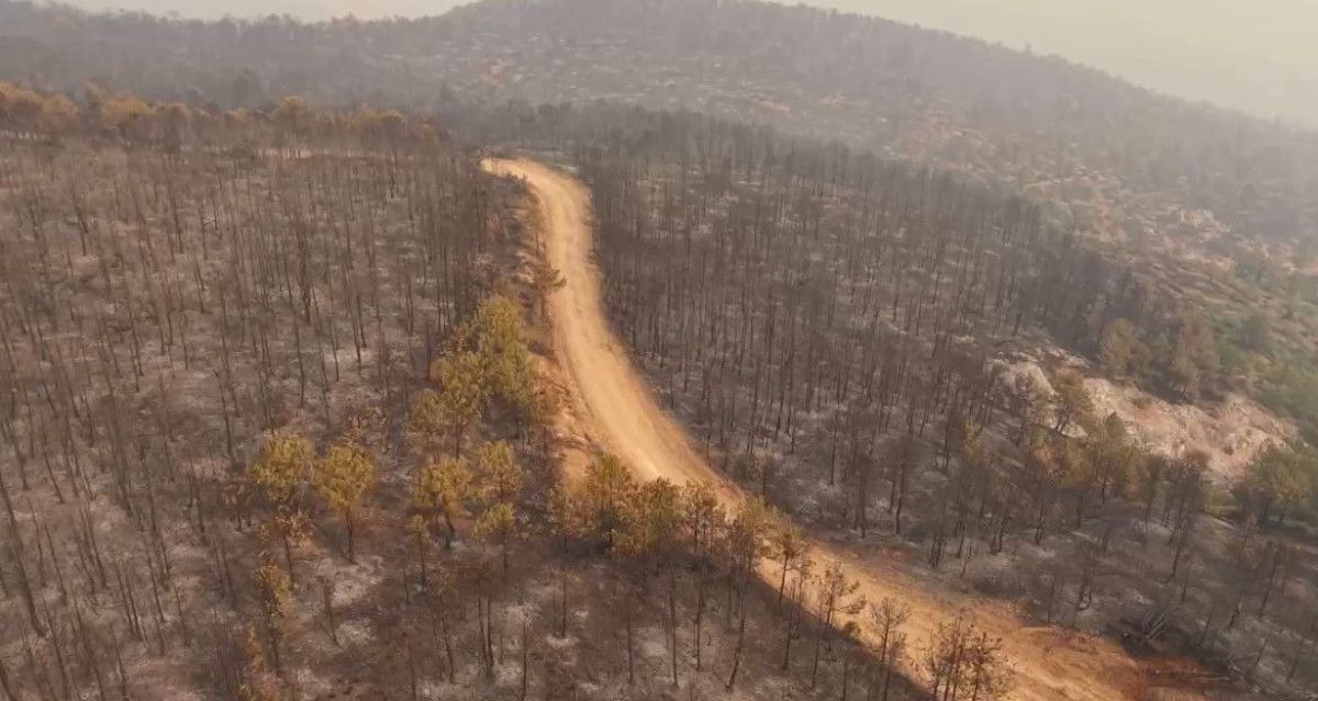 Çakmak Mahallesi etrafında yangından geriye kalan küller, sabah ‘drone’la görüntülendi.