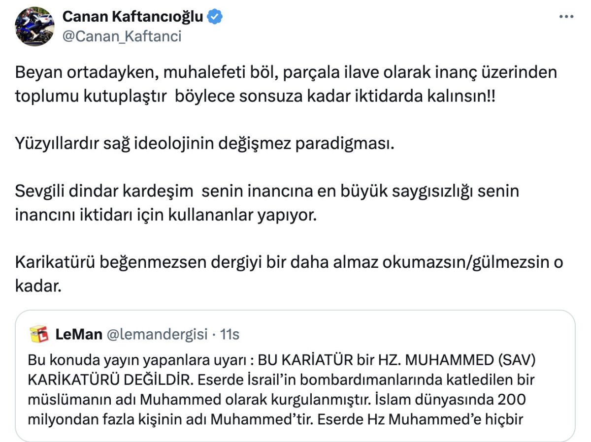 Kaftancıoğlu, açıklamasını “Karikatürü beğenmezsen mecmuayı bir daha almaz okumazsın/gülmezsin o kadar.” diyerek sonlandırdı.