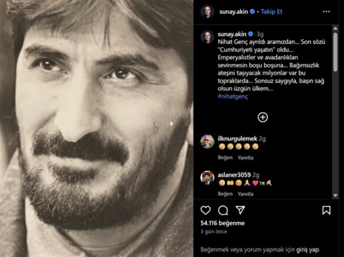 Akın, “Nihat Genç ayrıldı aramızdan… Son kelamı “Cumhuriyeti yaşatın” oldu… Emperyalistler ve avadanlıkları sevinmesin boşu boşuna… Bağımsızlık ateşini taşıyacak milyonlar var bu topraklarda… Sonsuz hürmetle, başın sağ olsun üzgün ülkem…” notuyla paylaşım yaptı.