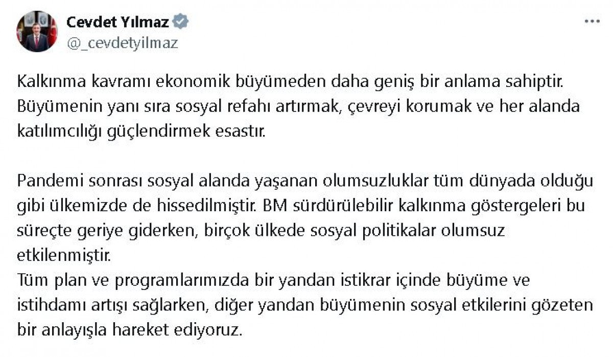 Kalkınma kavramı, ekonomik büyümeden daha geniş bir anlama sahiptir. Büyümenin yanı sıra sosyal refahı artırmak, çevreyi korumak ve her alanda katılımcılığı güçlendirmek esastır. Pandemi sonrası sosyal alanda yaşanan olumsuzluklar tüm dünyada olduğu gibi ülkemizde de hissedilmiştir. BM sürdürülebilir kalkınma göstergeleri bu süreçte geriye giderken, birçok ülkede sosyal politikalar olumsuz etkilenmiştir.