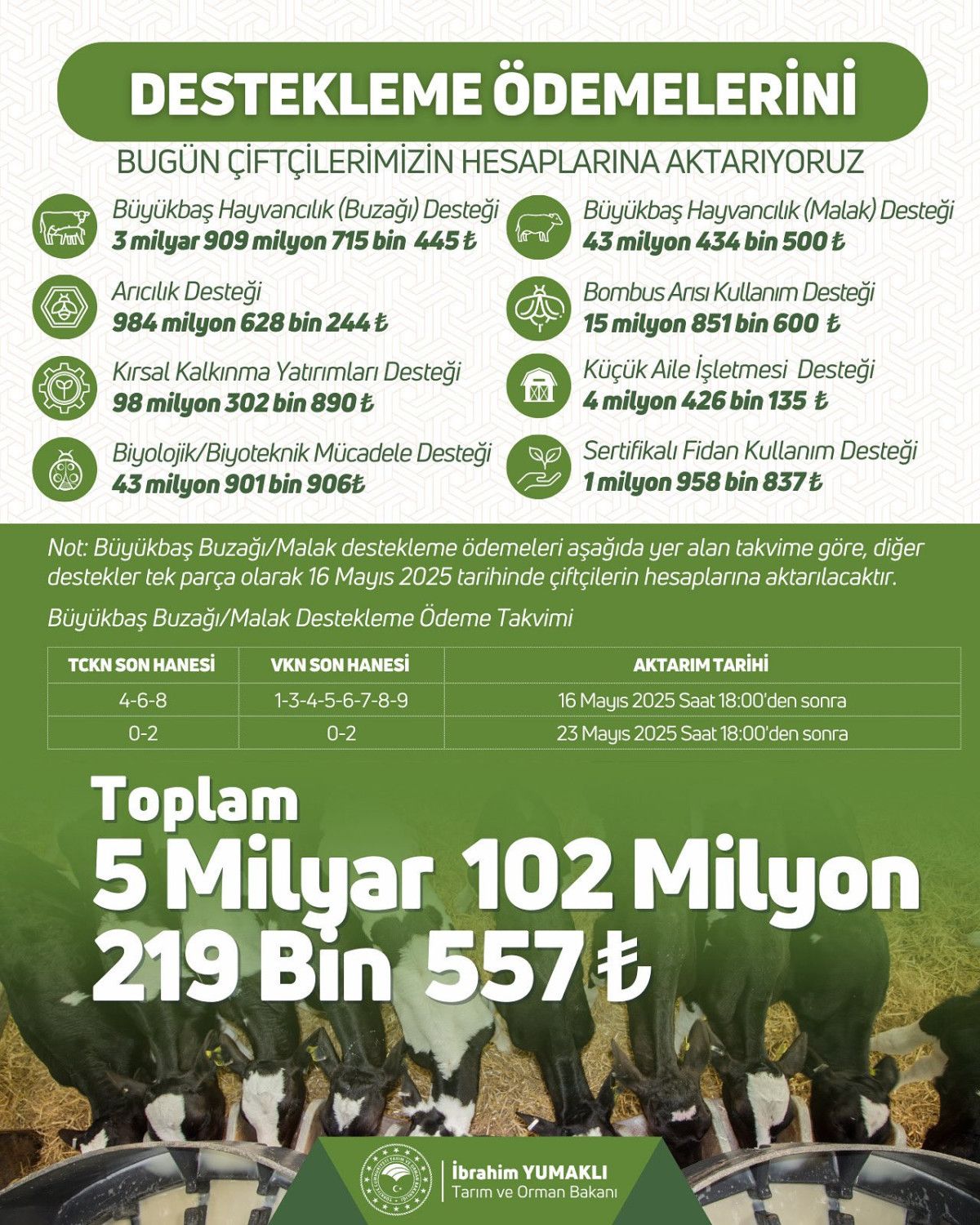Tarım ve Orman Bakanı İbrahim Yumaklı, sosyal medya hesabından destekleme ödemelerine ait paylaşımda bulundu.
