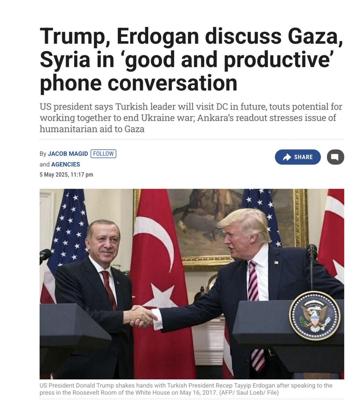 Haberin devamında, “ABD Başkanı Donald Trump, Türkiye Cumhurbaşkanı Recep Tayyip Erdoğan ile ‘son derece güzel ve yapıcı’ bir görüşme gerçekleştirdiğini, görüşşmeleri sırasında Rusya-Ukrayna savaşını, Suriye, Gazze’deki durumu ve başka mevzuları konuştuğunu bildirdi.” sözlerine yer verildi.