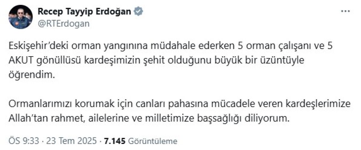 Erdoğan, toplumsal medya hesabından yaptığı paylaşımda, yangına müdahale sırasında şehit olan 5 orman çalışanı ile 5 AKUT gönüllüsünün acısını derin bir hüzünle öğrendiğini belirtti.