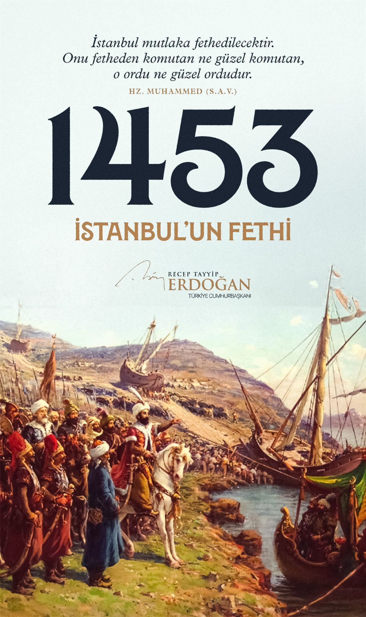 Cumhurbaşkanı, paylaşımına Peygamber Efendimiz Hz. Muhammed’in (s.a.v) “İstanbul kesinlikle fethedilecektir. Onu fetheden kumandan ne hoş kumandan, o ordu ne hoş ordudur” hadisinin yer aldığı bir görseli de ekleyerek, fethin manevî derinliğini vurguladı.