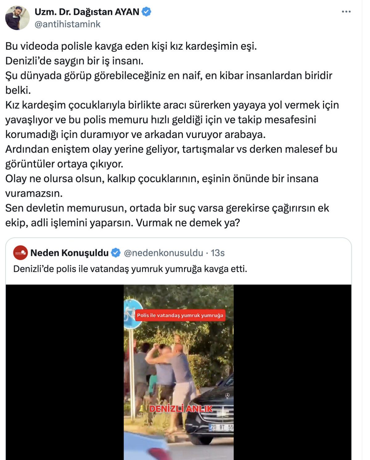 Bu görüntüde polisle arbede eden kişi kız kardeşimin eşi. Denizli’de saygın bir iş insanı. Şu dünyada görüp görebileceğiniz en naif, en kibar insanlardan biridir tahminen.