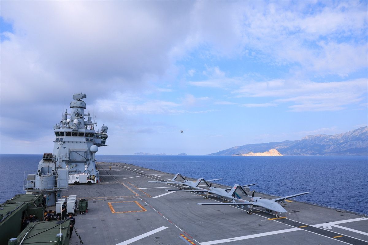 DENİZKURDU-II/2025 Tatbikatı Seçkin Gözlemci Günü’nde Deniz Kuvvetleri Kumandanı Oramiral Ercüment Tatlıoğlu, Kara Kuvvetleri Kumandanı Orgeneral Selçuk Bayraktaroğlu, Hava Kuvvetleri Kumandanı Orgeneral Ziya Cemal Kadıoğlu, Cumhurbaşkanlığı Savunma Sanayii Başkanı Haluk Görgün, ASELSAN Genel Müdürü Ahmet Akyol, Baykar Yönetim Kurulu Lideri Selçuk Bayraktar tatbikatı TCG Anadolu Gemisi’nden takip etti.