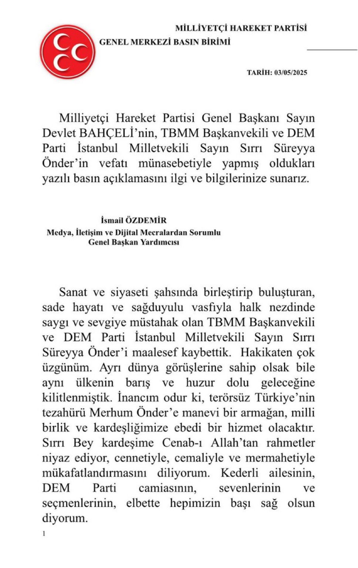 Sanat ve siyaseti şahsında birleştirip buluşturan, sade hayatı ve sağduyulu vasfıyla halk nezdinde hürmet ve sevgiye müstahak olan TBMM Başkanvekili ve DEM Parti İstanbul Milletvekili Sayın Sırrı Süreyya Önder’i maalesef kaybettik.