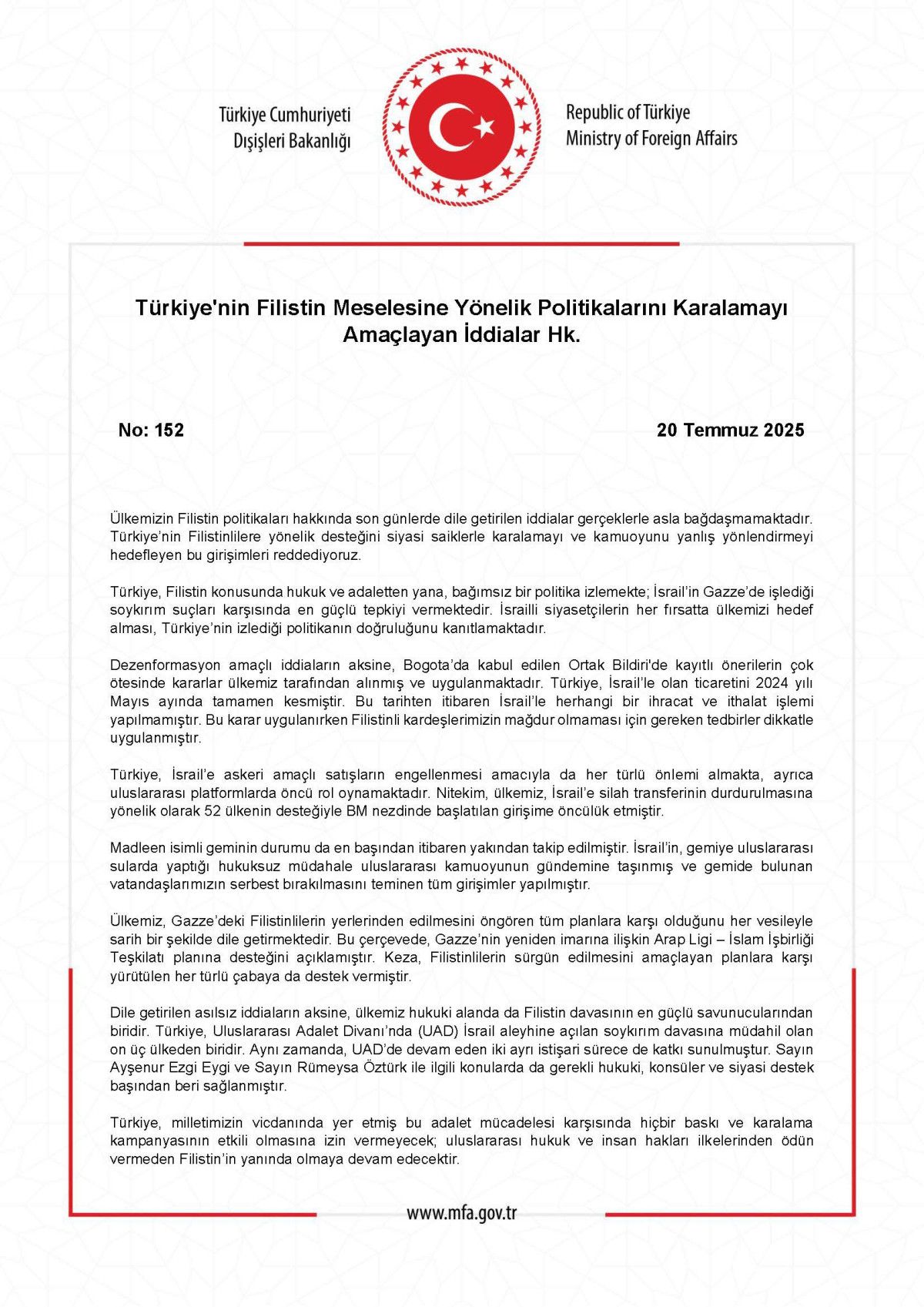 Türkiye’nin Filistin problemine yönelik siyasetlerini karalamayı amaçlayan tezler hakkında yapılan yazılı açıklamada, Türkiye’nin Filistin siyasetleri hakkında son günlerde lisana getirilen tezlerin gerçeklerle asla bağdaşmadığı vurgulanarak, “Türkiye’nin Filistinlilere yönelik dayanağını siyasi saiklerle karalamayı ve kamuoyunu yanlış yönlendirmeyi hedefleyen bu teşebbüsleri reddediyoruz. Türkiye, Filistin konusunda hukuk ve adaletten yana, bağımsız bir siyaset izlemekte; İsrail’in Gazze’de işlediği soykırım hataları karşısında en güçlü yansıyı vermektedir. İsrailli siyasetçilerin her fırsatta ülkemizi amaç alması, Türkiye’nin izlediği siyasetin doğruluğunu kanıtlamaktadır.” sözlerine yer verildi.