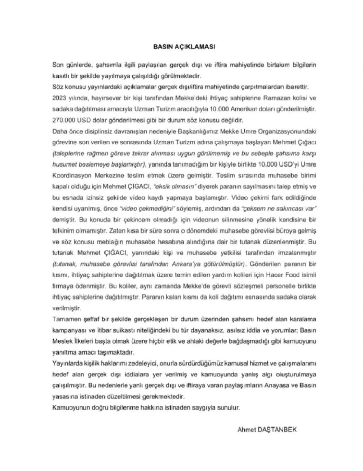 Söz konusu yayınlardaki açıklamalar gerçek dışı/iftira mahiyetinde çarpıtmalardan ibarettir. 2023 yılında hayırsever bir kişi tarafından Mekke’deki gereksinim sahiplerine Ramazan kolisi ve sadaka dağıtılması gayesiyle Uzman Turizm aracılığıyla 10 bin Amerikan doları gönderilmiştir. 270 bin dolar gönderilmesi üzere bir durum kelam konusu değildir.